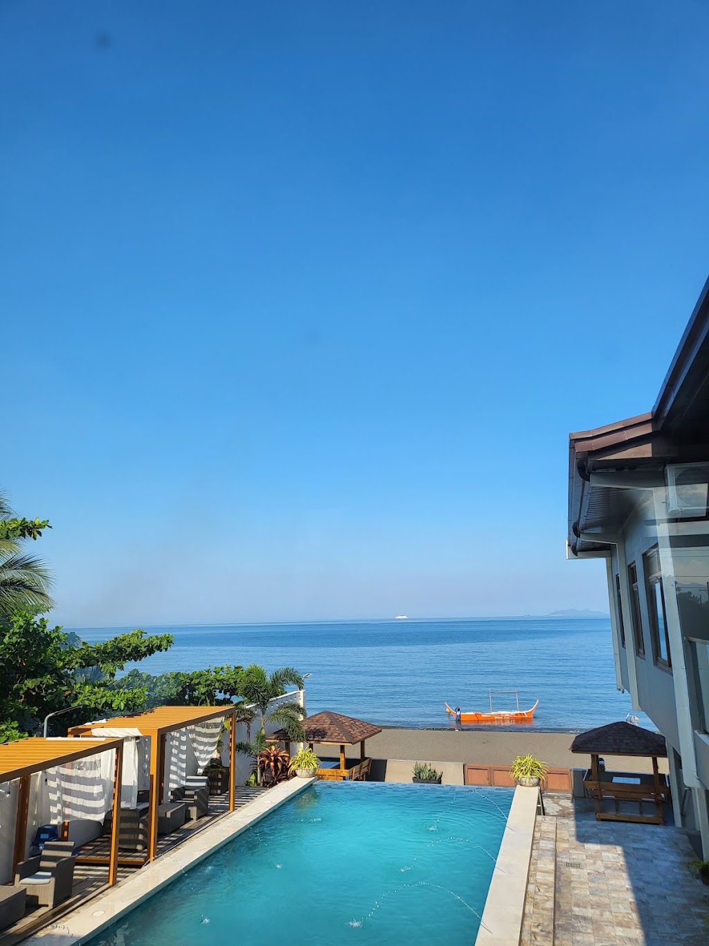 The resort is beautiful and looks new, but I don't think they're cleaning enough the rooms. May mga hair na sa drainage ng cr namin kahit di pa namin nagagamit, and the floor mat has a lot of moulds na. Staff are welcoming naman, but I don't see them much during our stay so medyo difficult especially if may need ka (Joyce was the most helpful one). I requested and paid the service fee to have our breakfast in one of their kubo facing the beach. I was too excited for the food especially the kapeng barako, but to our surprise, the waiter gave us hot water, a sachet of Nescafe instant coffee and few creamer and sugar on the side. When we asked why hindi kapeng barako yung snerve, he just said na "sa resto daw siya kinukuha". We're speechless, I paid for the extra service fee naman and we're soaking wet din since kaka-dip lang namin sa pool, paano kami aakyat ng resto? The waiter can simply pour the barako in the cup instead of the hot water naman haaay -- luckily Joyce was there to help and replace our coffee. ☕️ 🍛 Restaurant - the food was good, generous serving. The pork sisig was very good. 🌊 Beach - the sand is fine, brownish, but not that clean, may mga nakita kaming plastic at mga bubog sa shore The resort is promising sana, hope they can improve the linis especially sa cr ng mga rooms and for the staff, i hope they're more present and attentive.